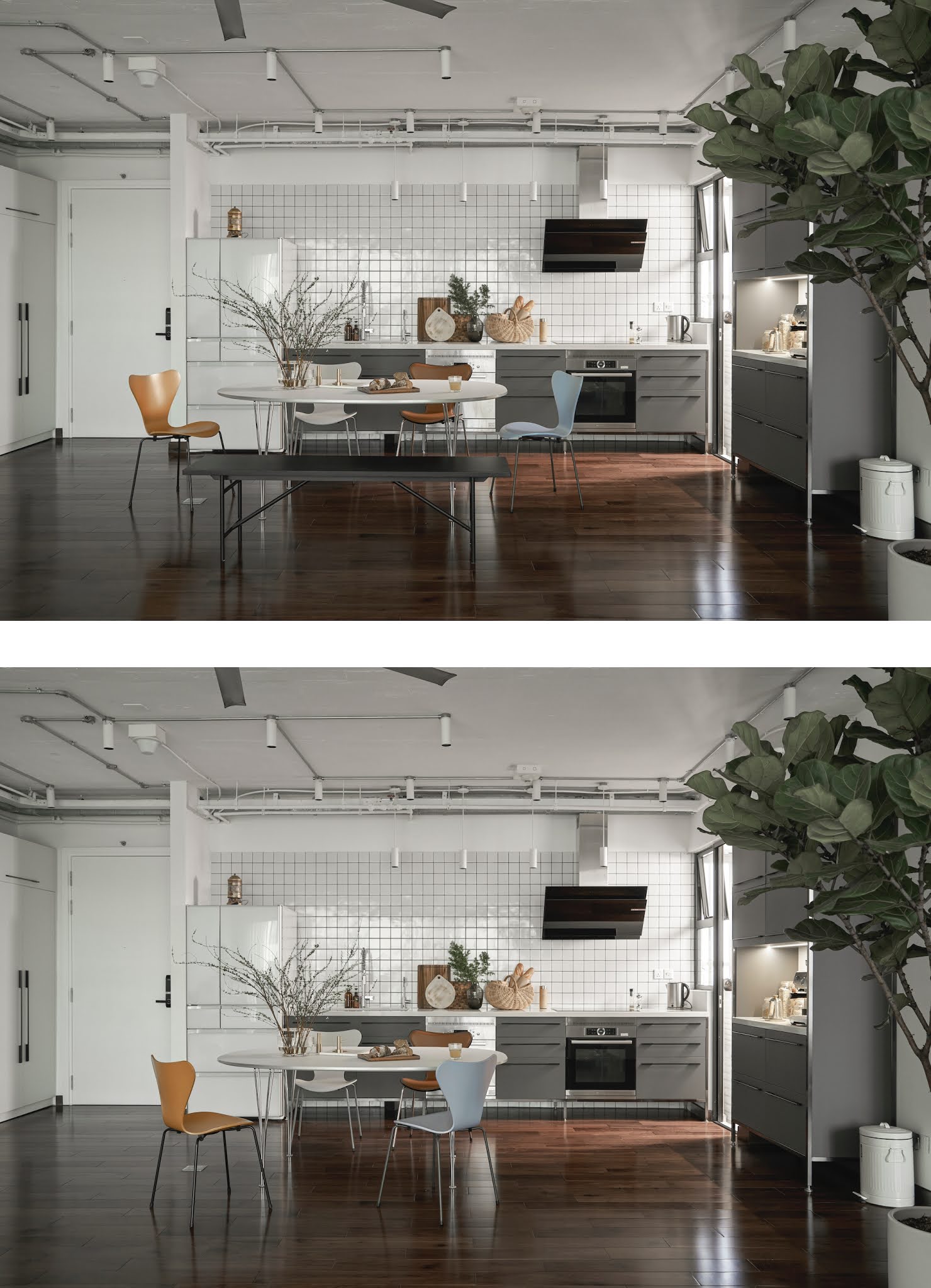Theo tiêu chí “không thừa không thiếu”, số lượng nội thất liền tường trong nhà được tiết chế, chỉ vừa đủ chứa đồ của gia đình chủ nhà. Ở khu bếp, nhóm thiết kế không bố trí tủ treo vì các tủ xung quanh và ở dưới đã đảm bảo không gian lưu trữ.
