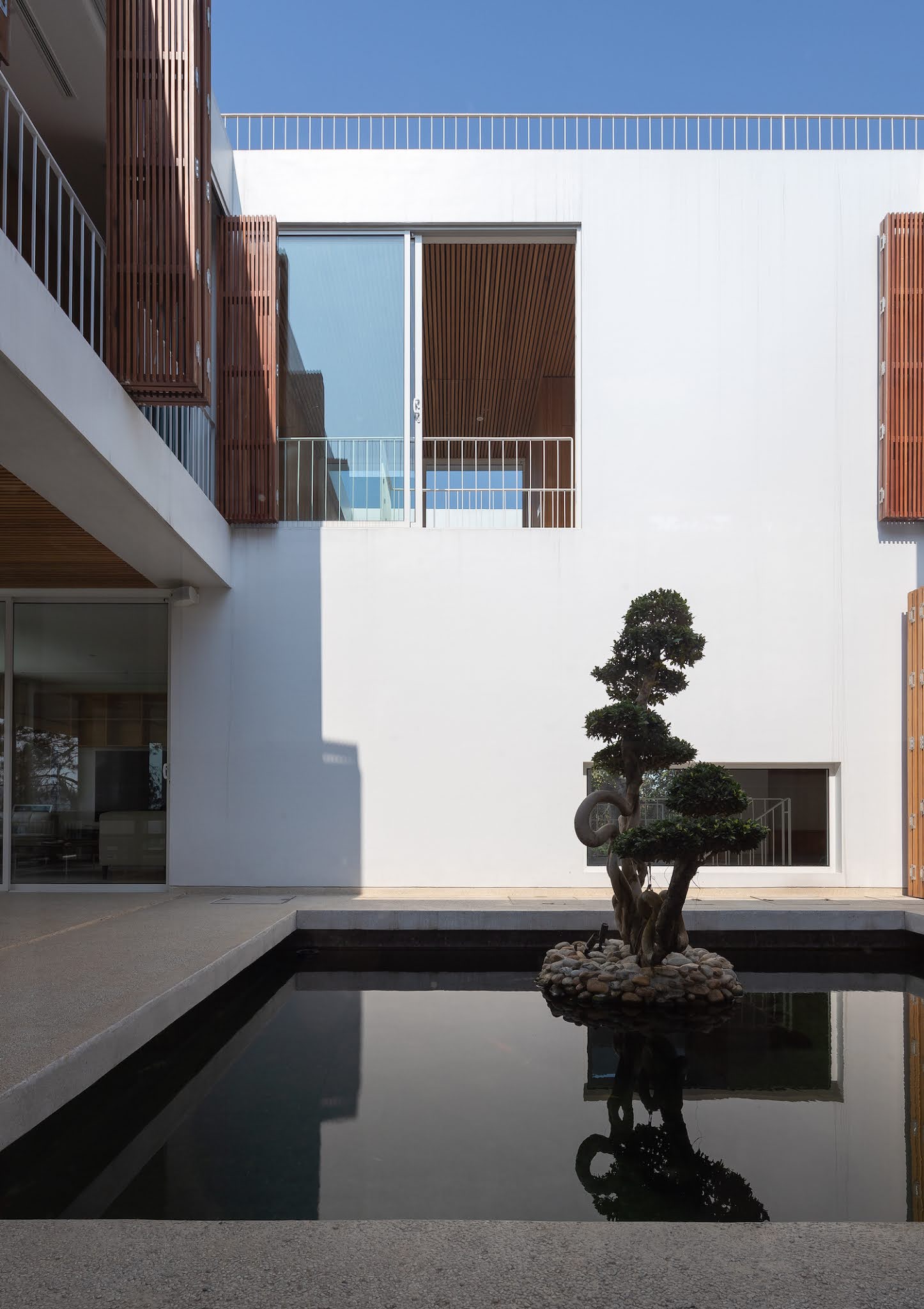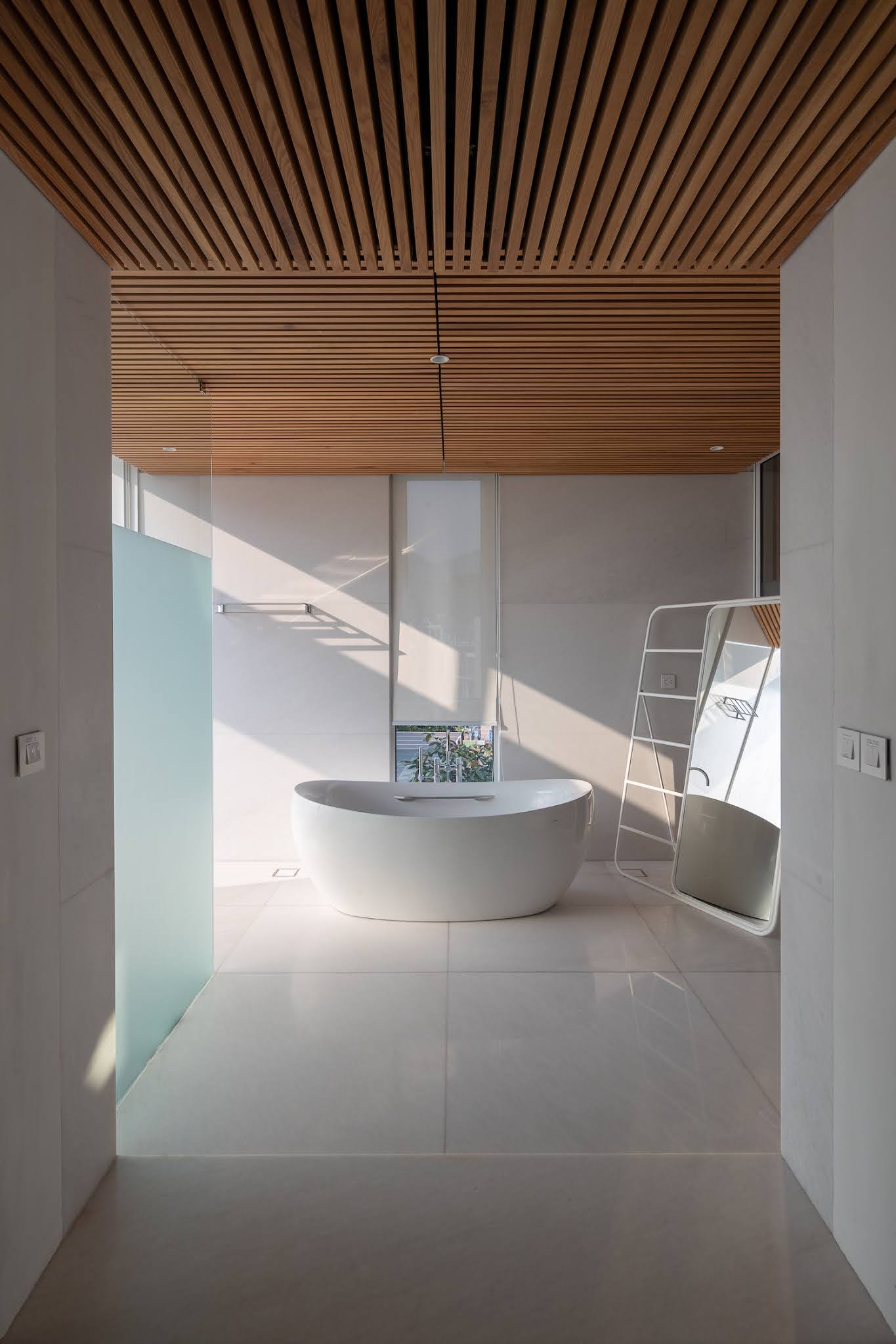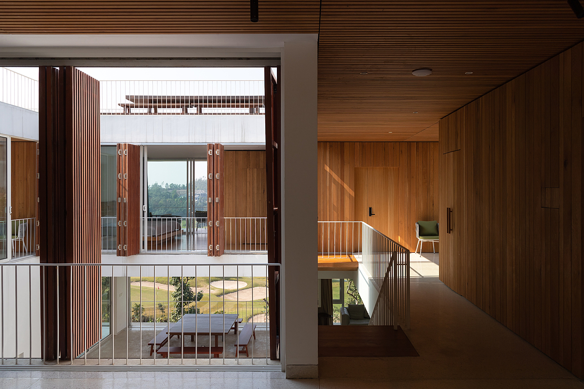 Tầng hai gồm phòng ngủ master và ba phòng ngủ nhỏ. Các không gian đặc rỗng đan lồng vào nhau, giúp công trình nhẹ nhàng hơn và tạo ra những góc nhìn xuyên nhiều lớp, tạo ra chiều sâu cho không gian. Gió và ánh sáng tự nhiên cũng có thể đến tất cả các không gian trong ngôi nhà.