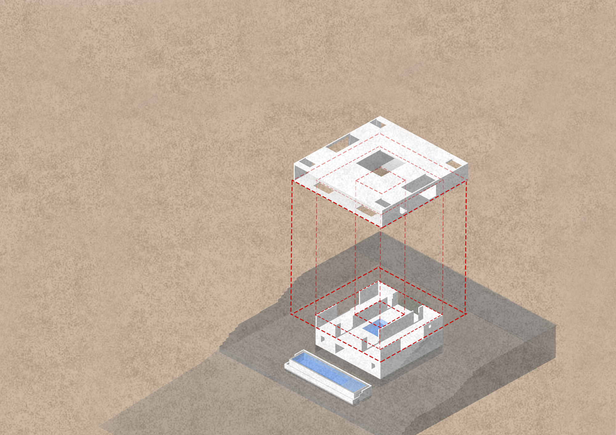 Hình khối kiến trúc của ngôi nhà đơn giản, bao gồm ba hình hộp vuông rỗng đặt chồng lên nhau, như một cây nấm mọc dưới chân núi.