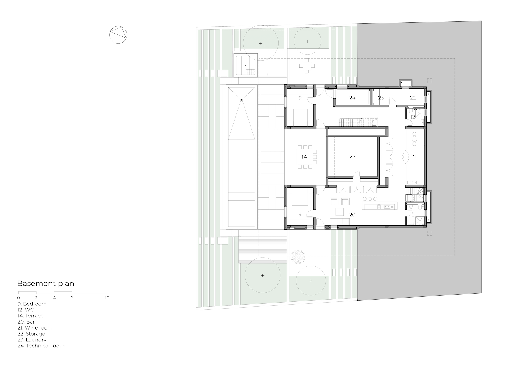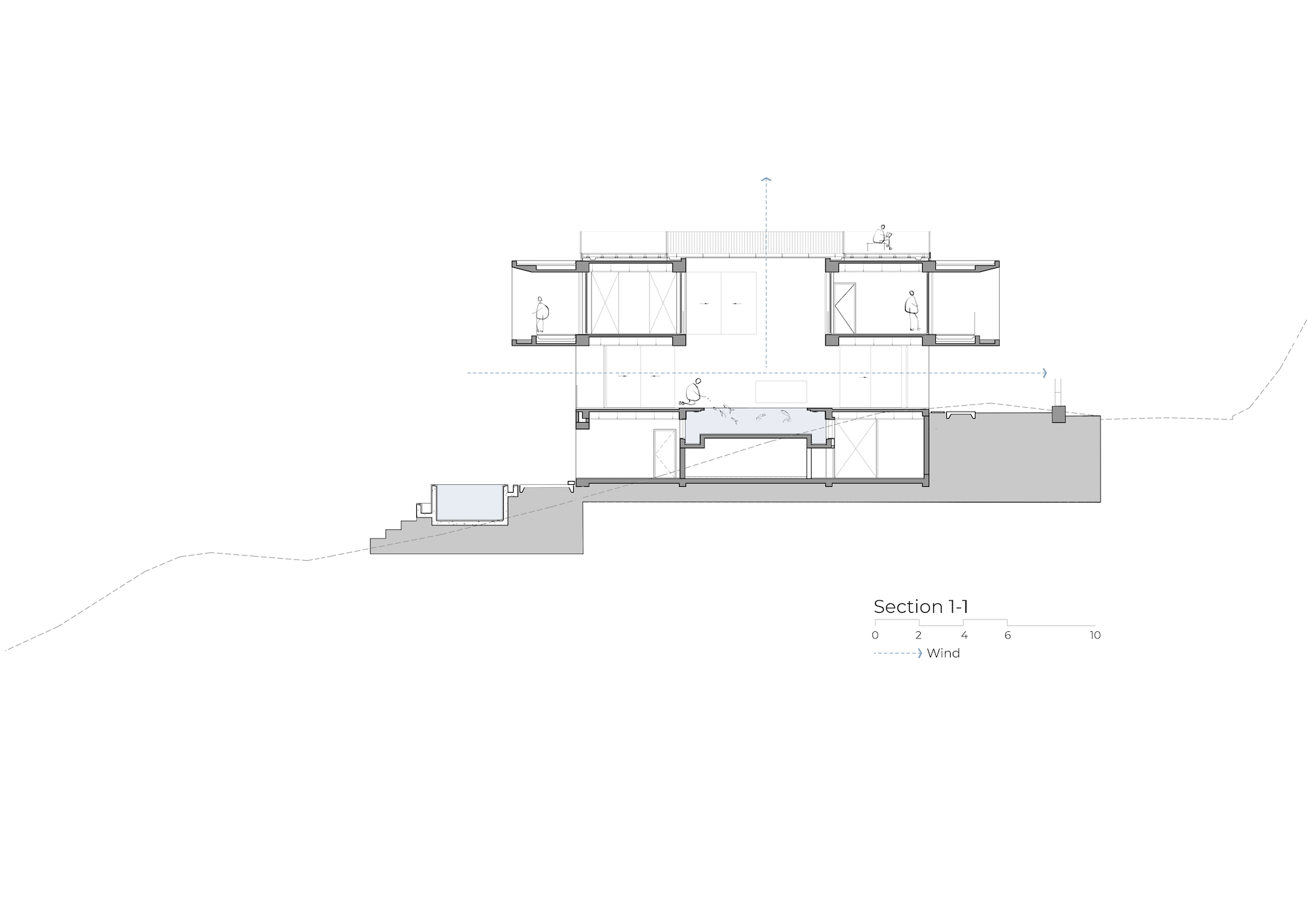 Tầng trệt đặt phòng khách và bếp chính kết nối với khu vực có thể tổ chức các bữa tiệc BBQ ngoài trời. Tầng hầm gồm hai phòng ngủ nhìn ra thung lũng, một quầy bar và hầm rượu. Do địa hình dốc thấp dần về phía thung lũng và quanh hồ cá có những vách kính lớn, tầng hầm vẫn có “view” và đầy sáng.