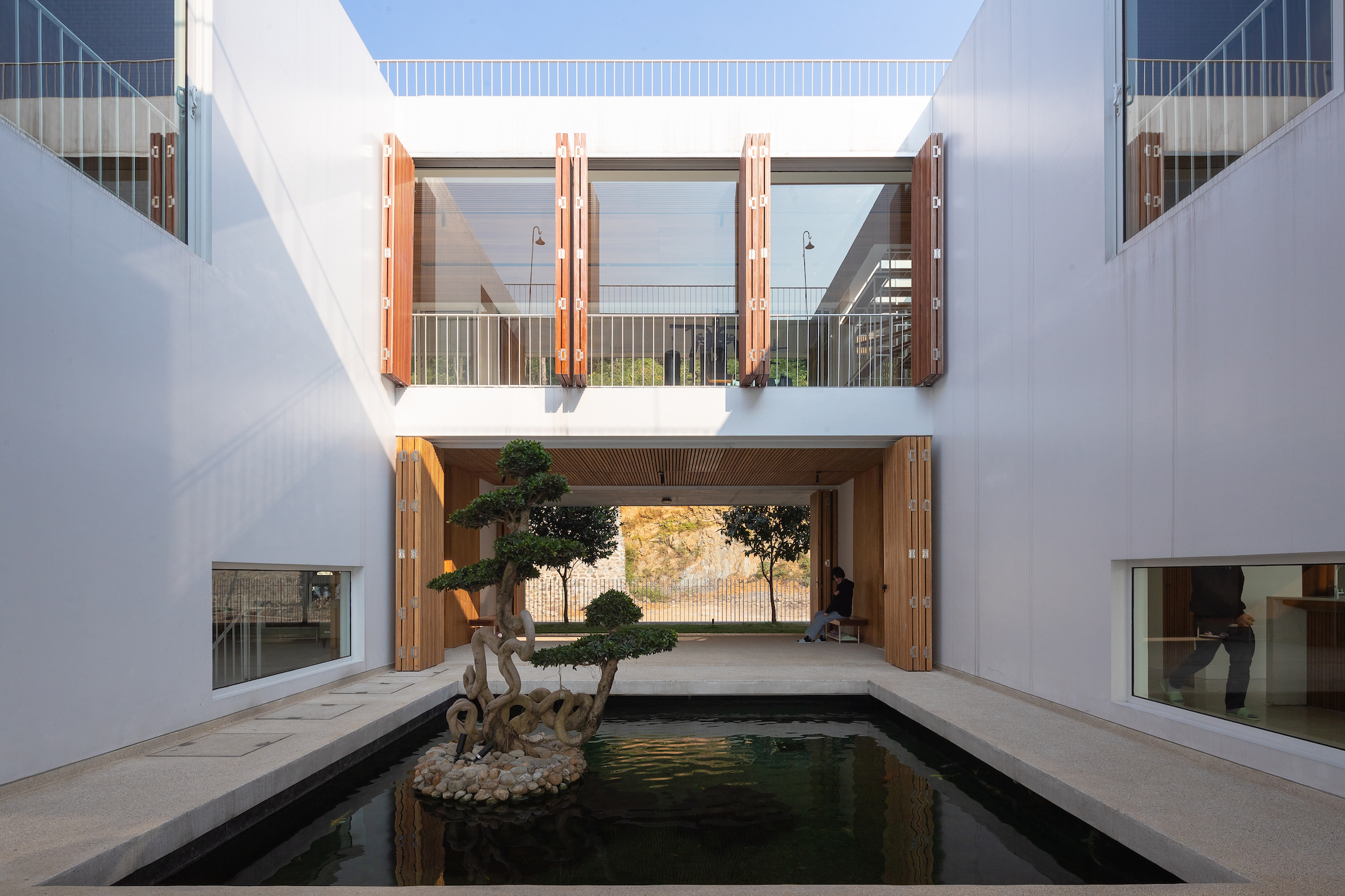 Các không gian đặc rỗng đan lồng vào nhau, giúp công trình nhẹ nhàng hơn và tạo ra những góc nhìn xuyên nhiều lớp, tạo ra chiều sâu cho không gian. Ảnh: Triệu Chiến.