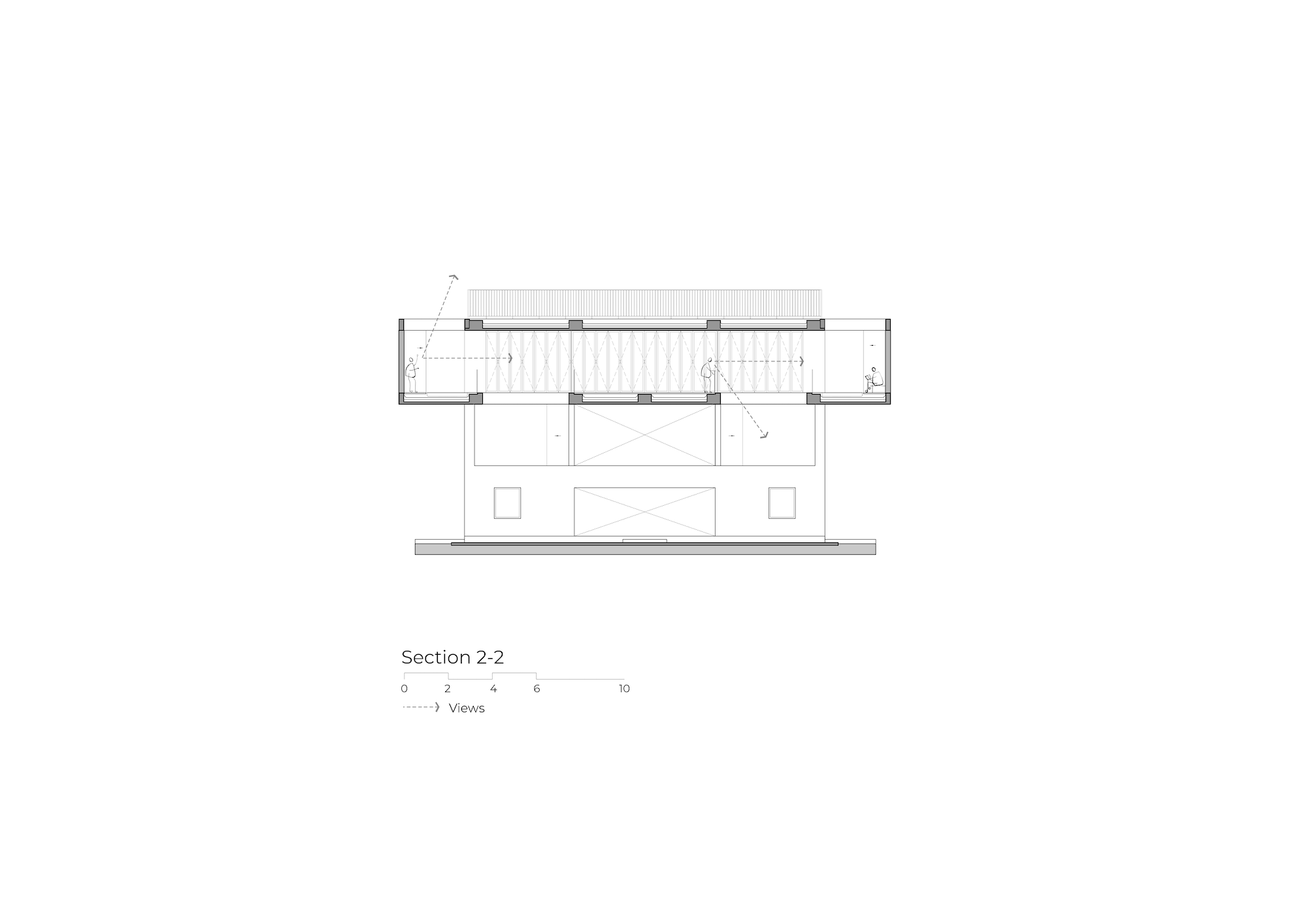 Những khoảng sân ngoài trời băng ngang nhà được đục lỗ để ngắt nhịp, giảm bớt cảm giác quá dài và đem tới thêm các góc nhìn xuyên theo chiều đứng. Chúng cũng cũng tạo ra một khoảng đệm như ranh giới mờ giữa bên trong nhà và cảnh quan ở ngoài.